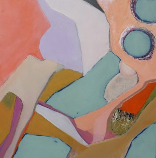 “I think of my current work as an aerial journey. The pieces create a schematic of place, inspired by fragmented terrain as glimpsed through the window seat of an airplane. Through this work, I investigate the intersection of the built and natural environment, seeking to find structure and sense of place. I am drawn to the rich colors, forms and lines from diverse ecosystems, agriculture, buildings, boundaries, waterways and the general beauty of Montana…and translating these into colorful and inviting abstract places.” Cherlyn Wilcox