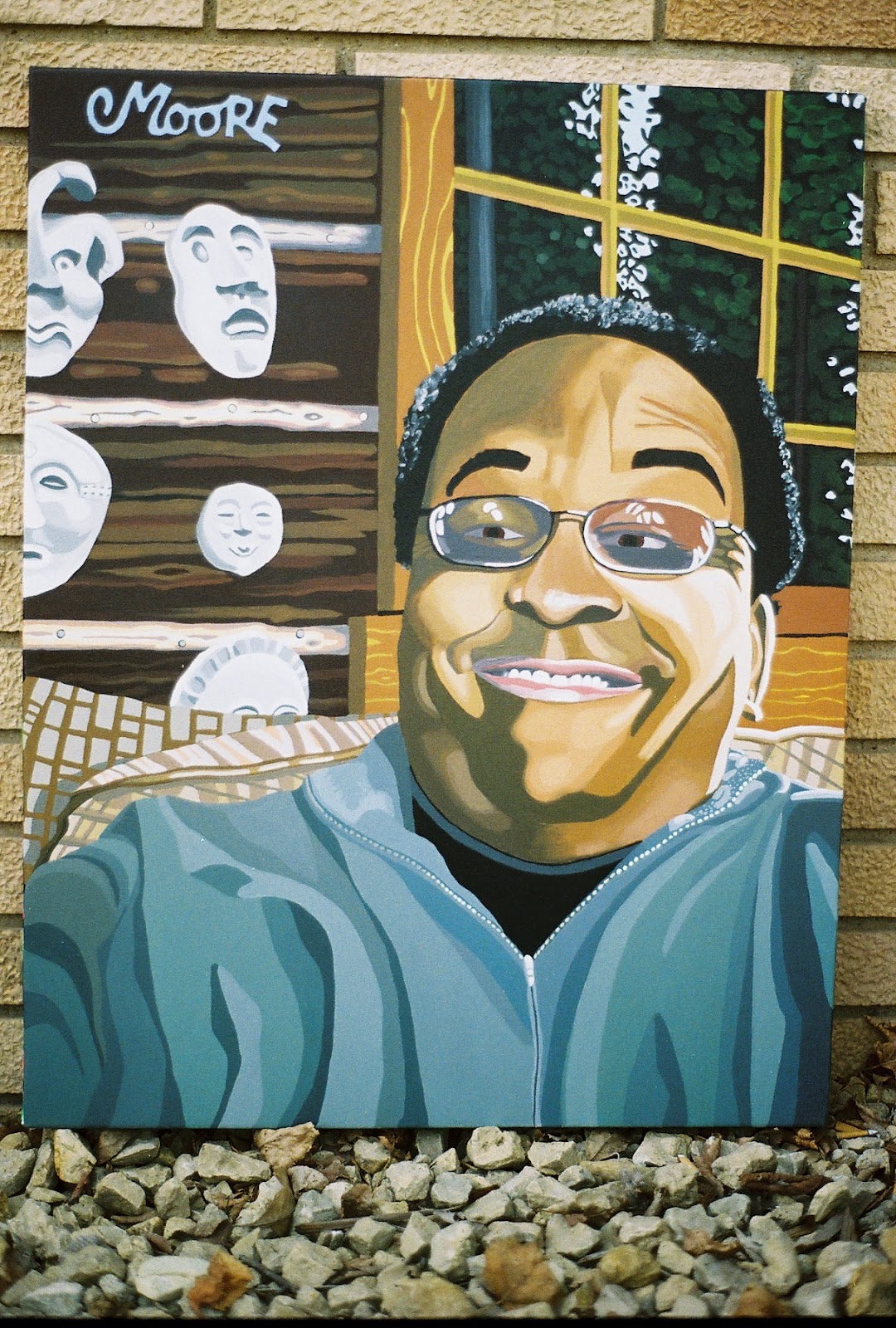 “The genesis of this show is in the fact that the majority of my neighbors in the North Fork do not have phones. What we’ve always done is hang a notepad & pencil next to our doors, so when someone stops by they can leave a message. Like…”I stoppt by-where are you?” Six years ago I added a new dimension by mounting a throw-a-way 35mm camera above my notepad with a sign that asks…”Please document your presence.” Over the years I have gathered hundreds of ‘self-portrait’ photos on or near my front porch. These are a small selection of those documents. The dates in the titles are the year the photo was taken. All paintings done in 2011-12. Hope you enjoy! Portrait commissions encouraged!!”