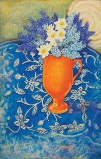 “I lose myself in time spent at the easel. Sometimes I am thinking/meditating spiritually and I don’t even know it. The intricacies of flowers are a mystical wonder. Most of the flowers I paint are from my garden. Their beauty is so fleeting, I wait patiently or impatiently all year for the lilacs and peonies. Anxiously I poke around under the dead leaves of last year looking for the first signs of spring snowdrops, muscari, crocus, mini jonquils. It’s heaven to gather a big enough bundle to take to the house. Within the settings of the paintings are placed personal objects: a blue platter my mom brought me from Portugal, a shell from Zihuatenejo, Mexico, grandmother’s burgandy crystal goblet, a glowing candle, a fleeting butterfly, a jar of Tiger Balm. Flowers don’t last long and luckily I can us the tools of camera and sketches for reference,