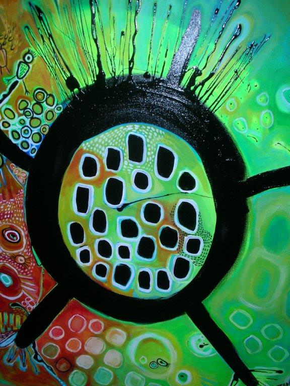 “My recent work is abstract and full of pattern,” Brooke explains, describing her paintings. “I simply enjoy the formal elements of paint on canvas. I want the viewer to enjoy the shapes and colors, and to experience a personal set of emotions from the piece. I use titles that aren’t defining, because I prefer that people draw their own conclusions about what they’re seeing and feeling. I hope my paintings feel somewhat primal, maybe even childlike. My recent influences have been southwestern petroglyphs and Aboriginal paintings. There is nothing complex or “heady” about what I do. What you see is what you get.”