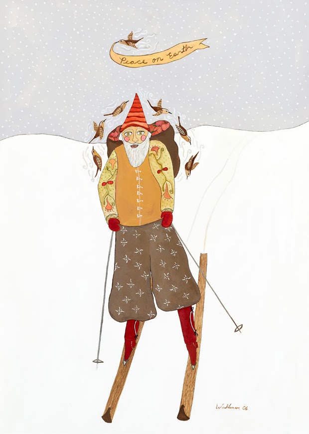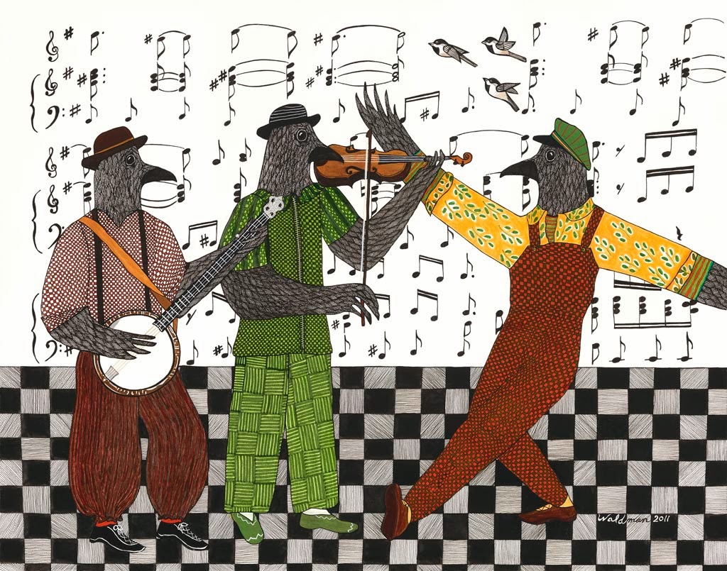 The Purple Pomegranate, a fine craft specialty store, is featuring work by Whitefish artist Kim Waldman during the month of December. In her mid twenties after graduating from nursing school, Kim found an old toolbox full of oil paints at a garage sale. She began painting portraits of friends in hats and became interested in self-portraits. A few years later Kim began painting with gouache, an opaque watercolor, and soon combined gouache with ink. Her artwork evolved into colorful and whimsical circus performers, musicians and dancers.
