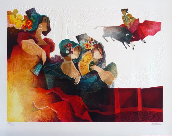 The artwork on display consists of 10 different lithographs. The “Carmen Suite” consists of a limited edition grouping of five, signed by the artist and numbered 5 of 20. Each lithograph is preceded by a page bearing a lithographed sketch by the artist, combined with several bars of the music from the opera “Carmen” by Bizet, from which the subject of each lithograph was derived. These pieces are available for sale as a suite. Five additional lithographs in a similar style of Alvar are also on display and will be sold individually.