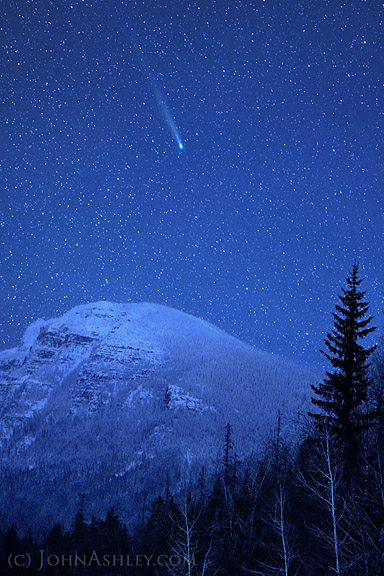 “Lovejoy” shows last December’s spectacular comet rising above the fire lookout on Mt. Brown, in Glacier Park.