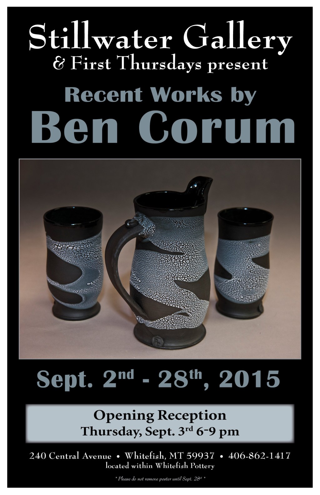 Please join us for food drinks and fun on first Thursday 09/03/15 featuring Ben Corum’s Woodfire Pottery and his Black & White Series.
