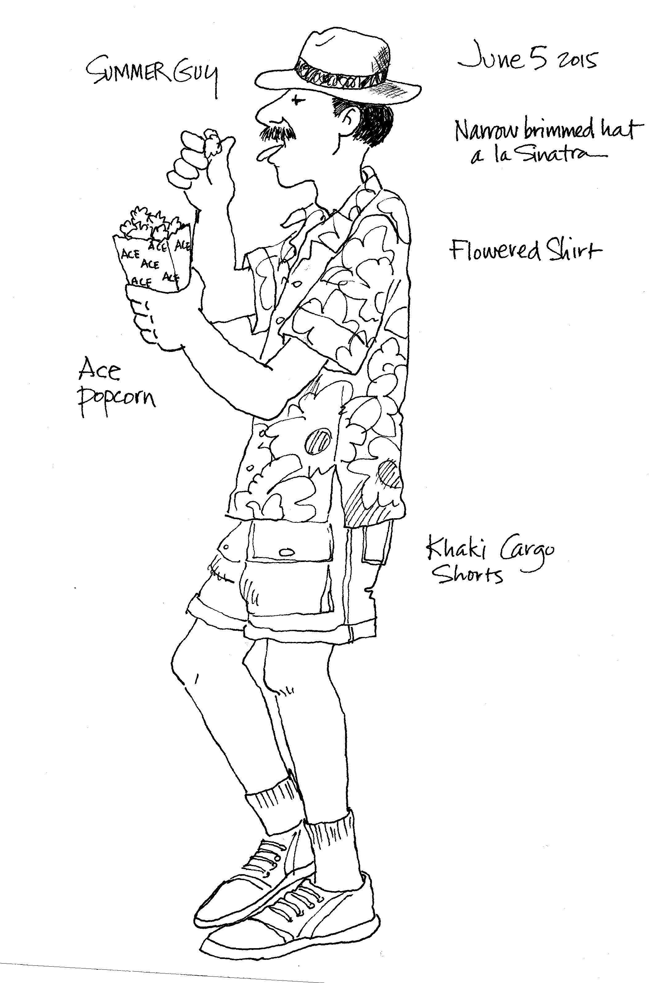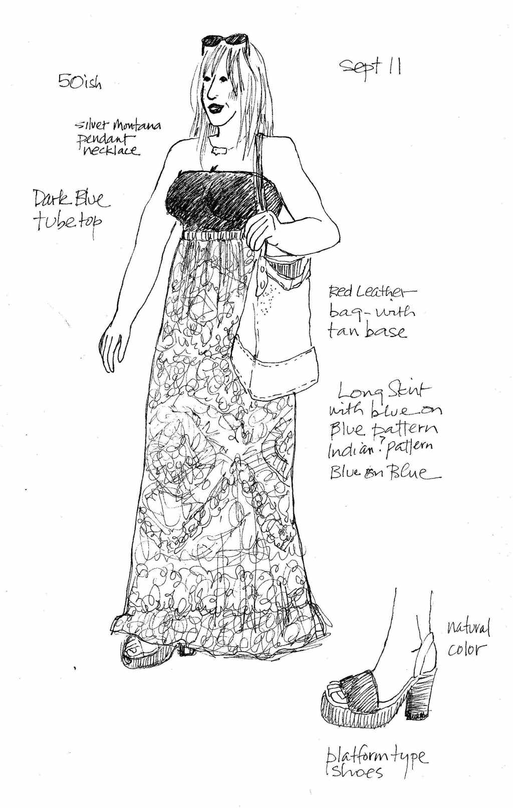 As a lifelong designer and artist, Nanci Williams finds the visitors to Whitefish and their outfits look like animated, life-size canvases walking around the sidewalks and shops as one-woman – or man — shows. It is this diversity and uniqueness that inspires her to continue drawing some of the people who have come into The Purple Pomegranate on Central Avenue where she works. Her first drawing was about 6 or 7 years ago of a young girl who came into the store wearing an intriguing visual salad of textures, patterns, colors and styles. Her attire stood out so boldly that Nanci had to remember her in a sketch. Once she drew her, Nanci began noticing other interestingly garbed subjects walking around. They were action figure models that challenged her figure drawing skills as they moved through the retail space “studio”. Whether it was a hairstyle, a combination of patterns or colors, an accessory flair, or some eccentric departure from whatever is generally thought of as normal, Nanci continues making sketches of the different looks that she sees.