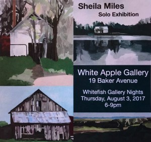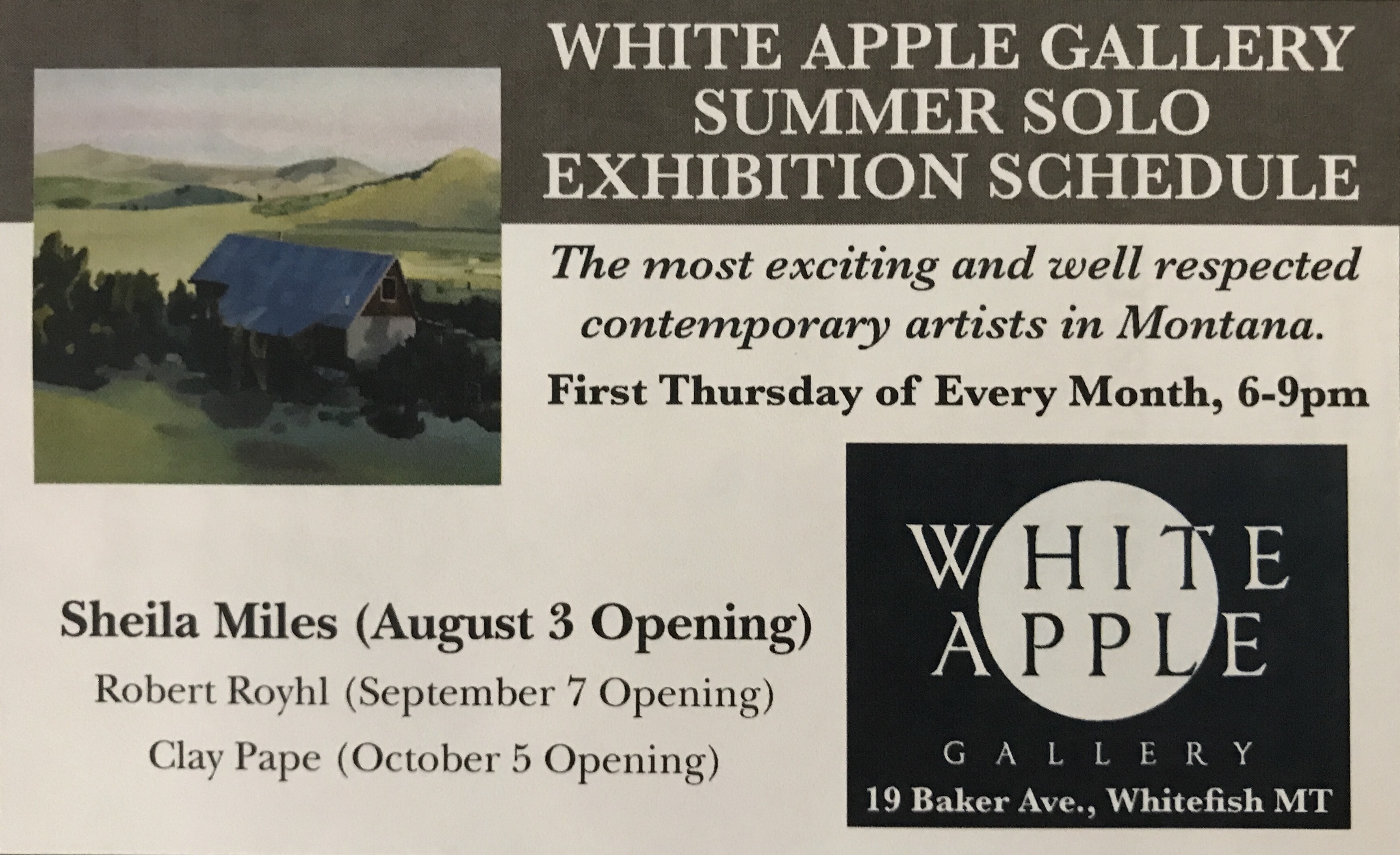 Please join us to celebrate the opening reception of Sheila Miles debut show in Whitefish, MT. She is one of the most accomplished contemporary western artists in Montana and the West and is represented in 17 public & museum collections. She currently lives in Santa Fe and after a recent and very successful one woman show at the Missoula Art Museum is going to be here in person in Whitefish for the opening reception of her solo show of 16 new pieces at White Apple Gallery. Please join us in welcoming this accomplished artist to the Flathead during Whitefish Gallery Nights, Thursday Aug. 3 from 6-9 PM. White Apple Gallery is located at 19 Baker Ave. next door to Markus Foods, with a second entrance a half block off Central Ave. on 1st street, across from the new parking garage.