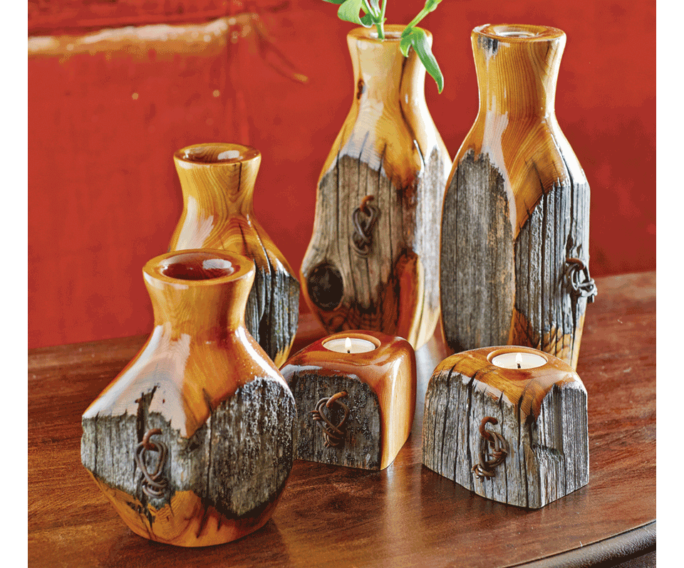 Dixie’s passion is to hold on to Montana heritage by using old fence posts in her work. Her family vacations are spent searching for old juniper and cedar fence posts that might have been in the landscape for over 100 years. The history and beauty in this wood is revealed when Dixie turns the fence posts on her lathe creating vases, lamps, and candle holders.